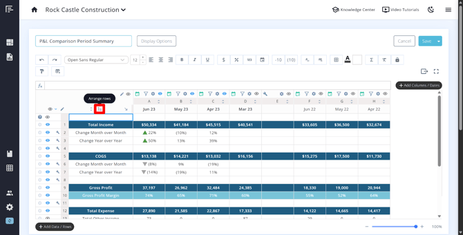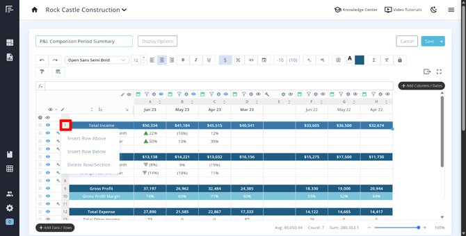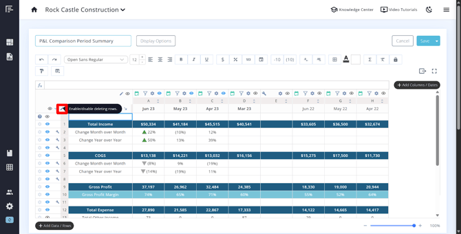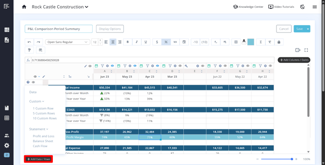 - Add custom rows (for formulas, labels, or manually entered data)