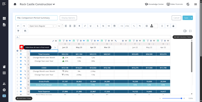 - Use the eye icon strategically to keep rows and columns in your builder for reference while hiding them from the client-facing version of the report.