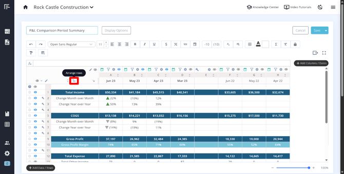 Tip: If you add a row using the Add Row button, it will default to the bottom of the metric or statement. Use the arrange rows icon (found above the first column) to click and drag rows into your preferred order.