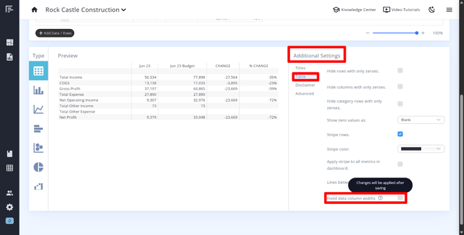 There is one setting that affects column width behavior: Fixed Column Data Widths. When enabled, this setting makes all columns the same width. This means that columns containing more text will wrap within the cell rather than extending beyond it. You can find this setting within the metric or statement builder in the Additional Settings > Table.
