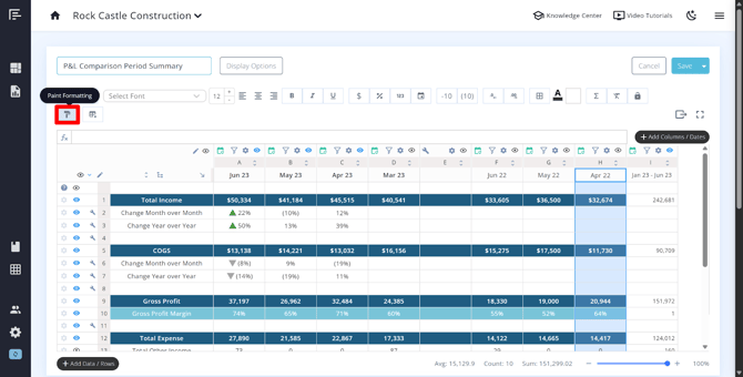 The paintbrush icon in the builder allows you to copy the formatting of a row, column, or cell and apply it to another. To use it: