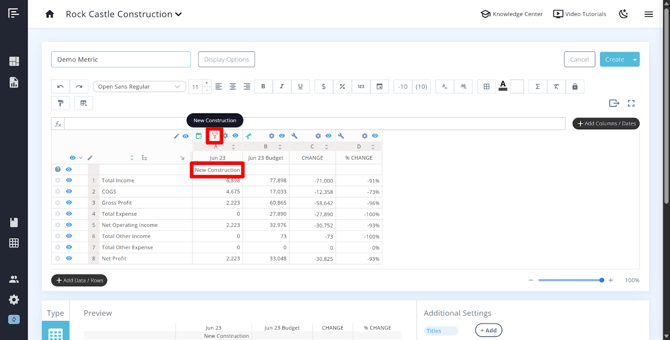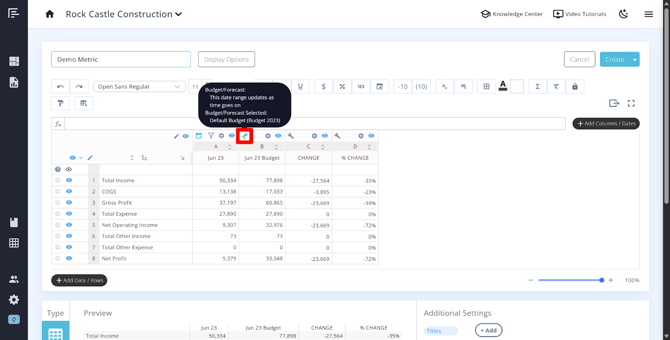 - If you need a column that shows a comparison between Actuals and Budget, use the Budget/Forecast column type with the appropriate date range and enable the Include Actuals option during setup.