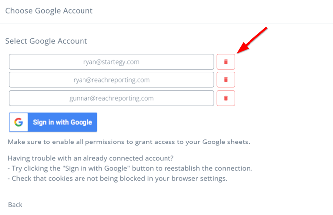 1. Disconnect the Google account by clicking the trashcan icon next to the email running into the issue.