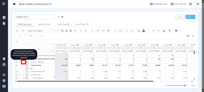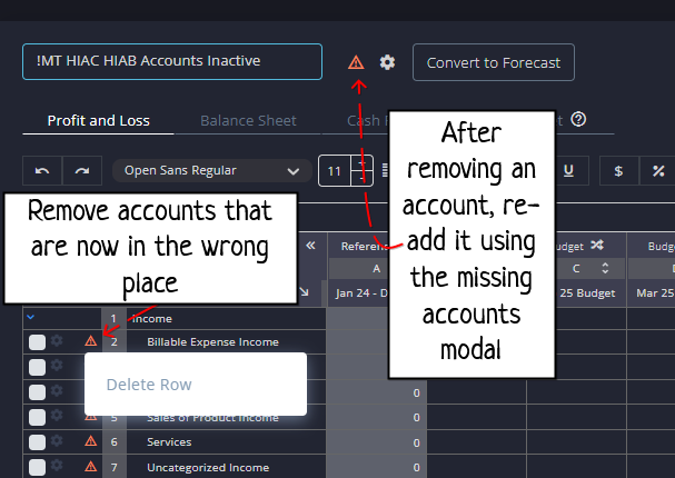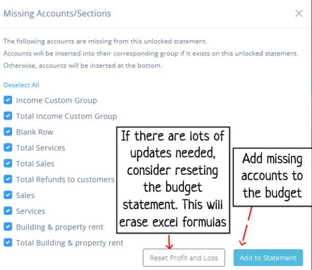 - Then Re-add the accounts by clicking the warning icon at the top of your budget statement to open the "Add Missing Accounts" modal and make updates based on the new COA: