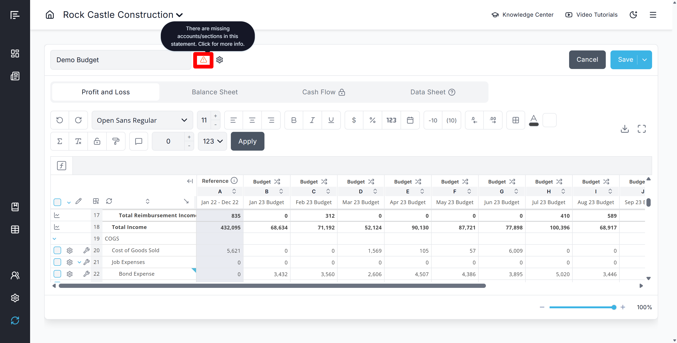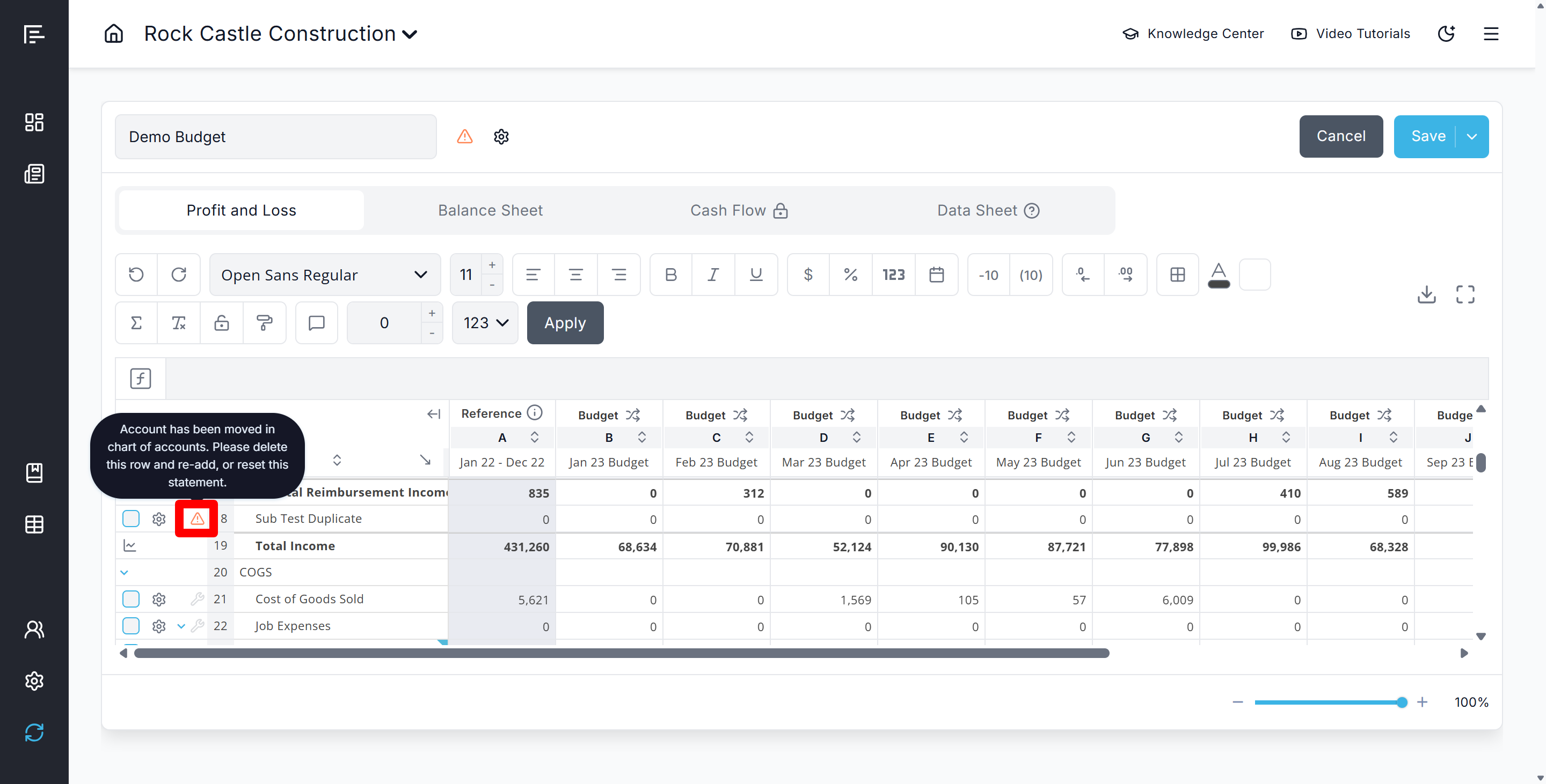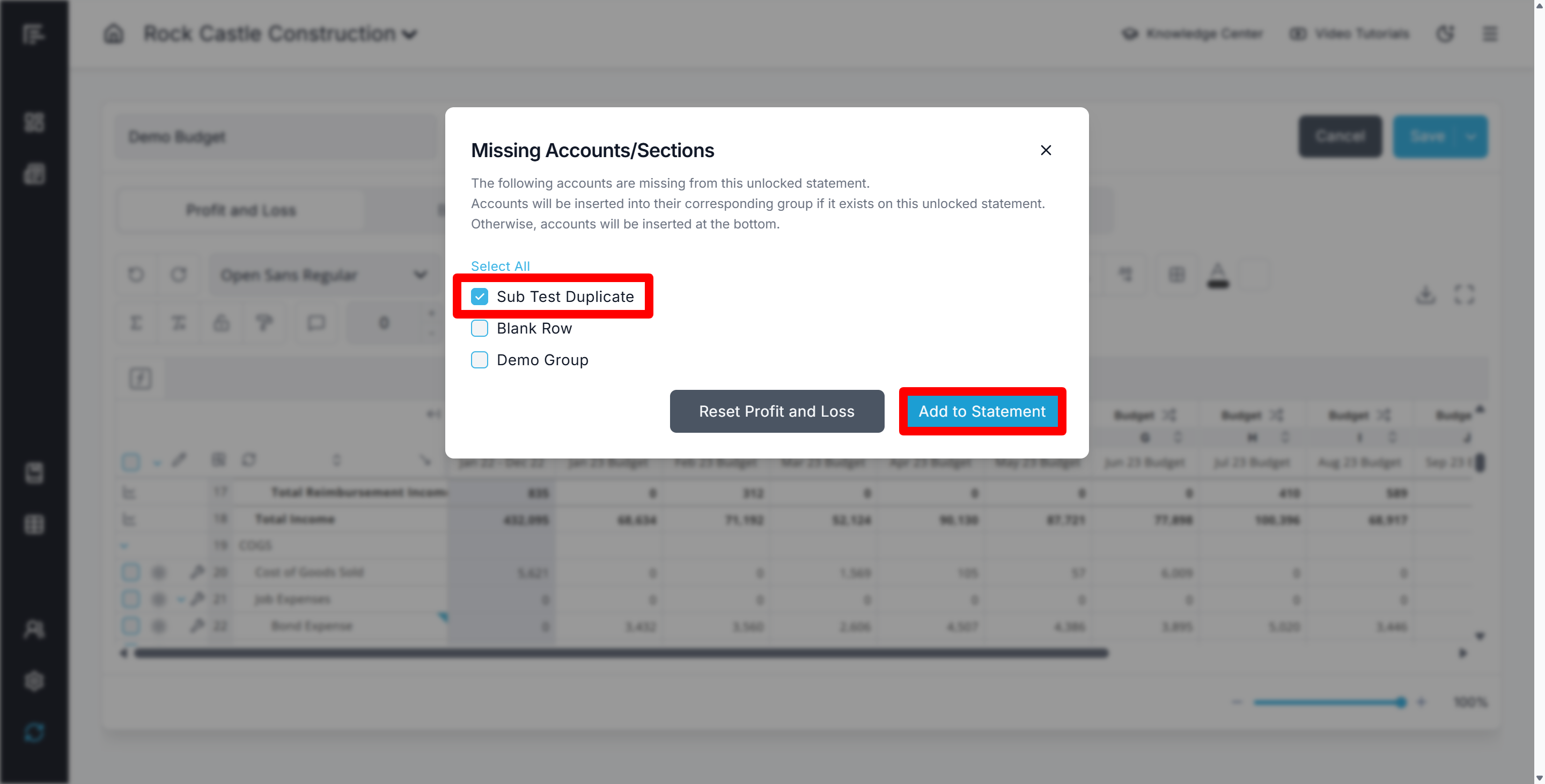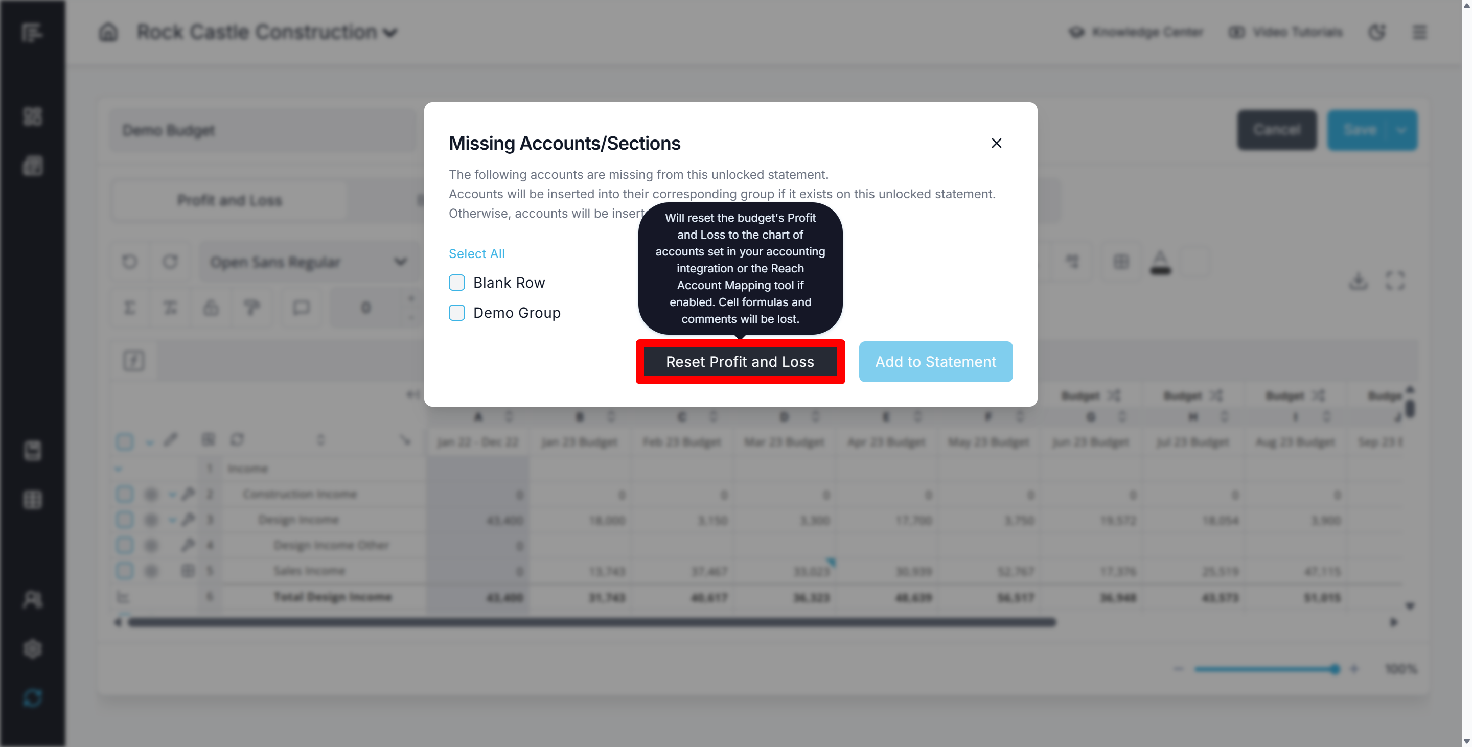 - Then Re-add the accounts by clicking the warning icon at the top of your budget statement to open the "Add Missing Accounts" modal and make updates based on the new COA: