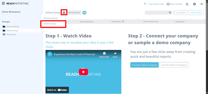 In order to delete a group, click on the gear icon once all companies have been removed from that group. You cannot delete the "Shared with me" group.