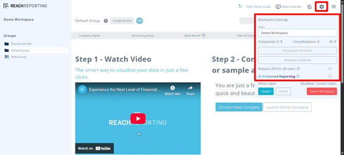 Set up your Workspace by clicking the gear icon in the upper right corner of the Workspace. This is only viewable by the Workspace Owner.