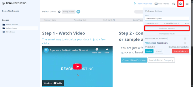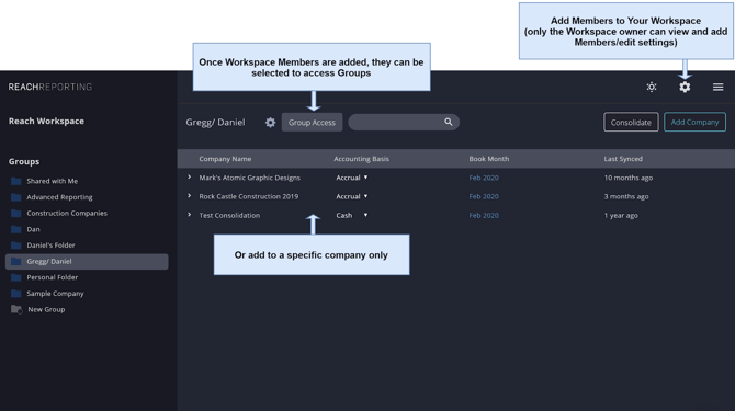 The Workspace Owner must add all Team Members that you want to have access to a group of companies or a single company. The Workspace Owner must first click the gear icon and add all Team Members, and then they can give access to the Groups.
