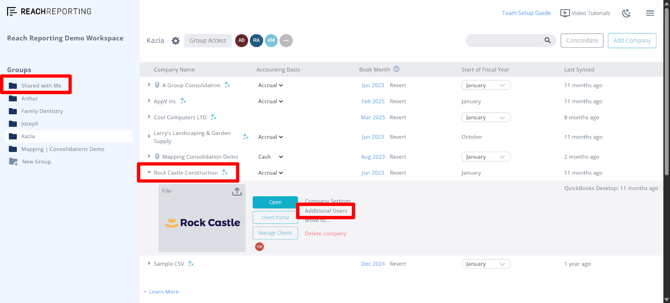 To add a Team Member to a single company, click the company name, and it will expand, then click "Additional Users" to add them. This will show up in their Shared with me folder. The shared folder is only used when an individual company is shared with you.