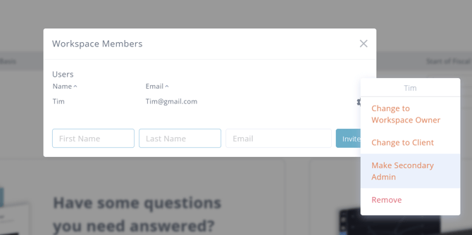 Workspace Owners can manage the billing, add new users to the workspace, assign secondary admin access, manage consolidation settings, change a user to a client or a client to a user, and transfer workspace ownership to a different user.